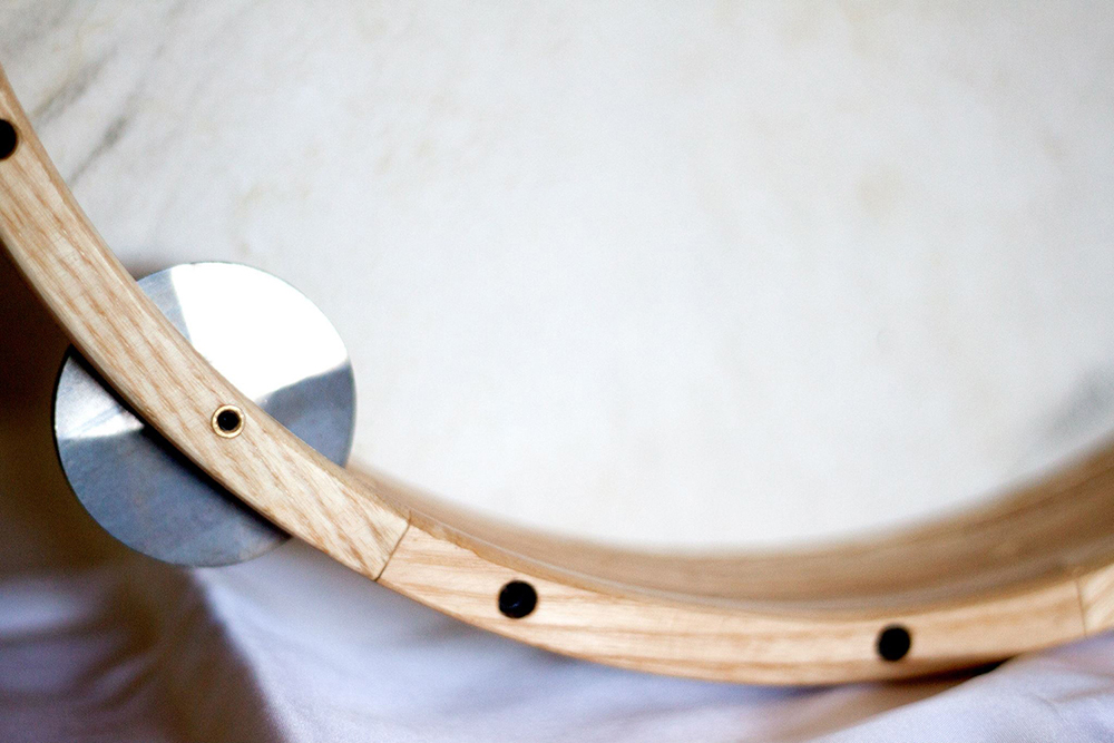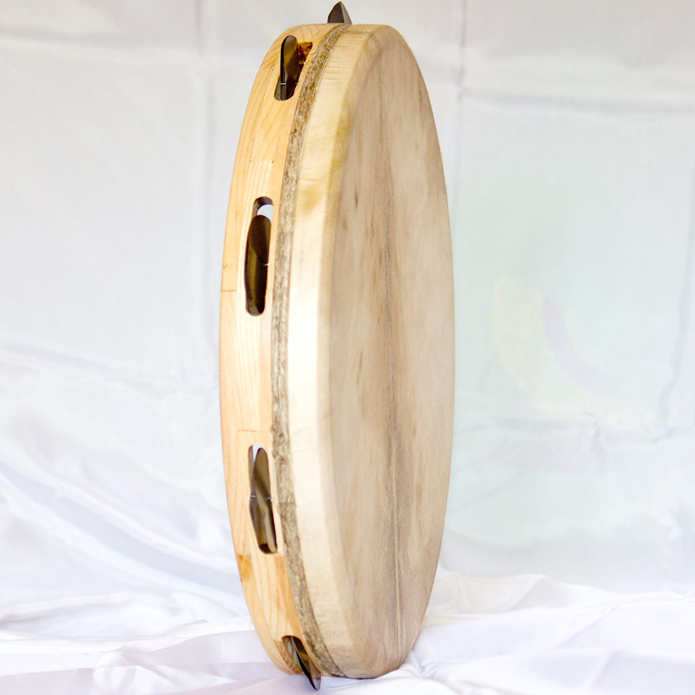 La cornice, costruita con segmenti in legno di frassino(brown ash), ha profondità di 5,5 cm(2”) e spessore di 1,2cm(0,5”) , viene tornita e sagomata per rendere il tamburello fortemente maneggevole senza comprometterne il suono caldo e potente, conferito dalla pelle di Capra morbida e flessibile , unica nel panorama dei tamburi a cornice.
